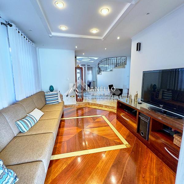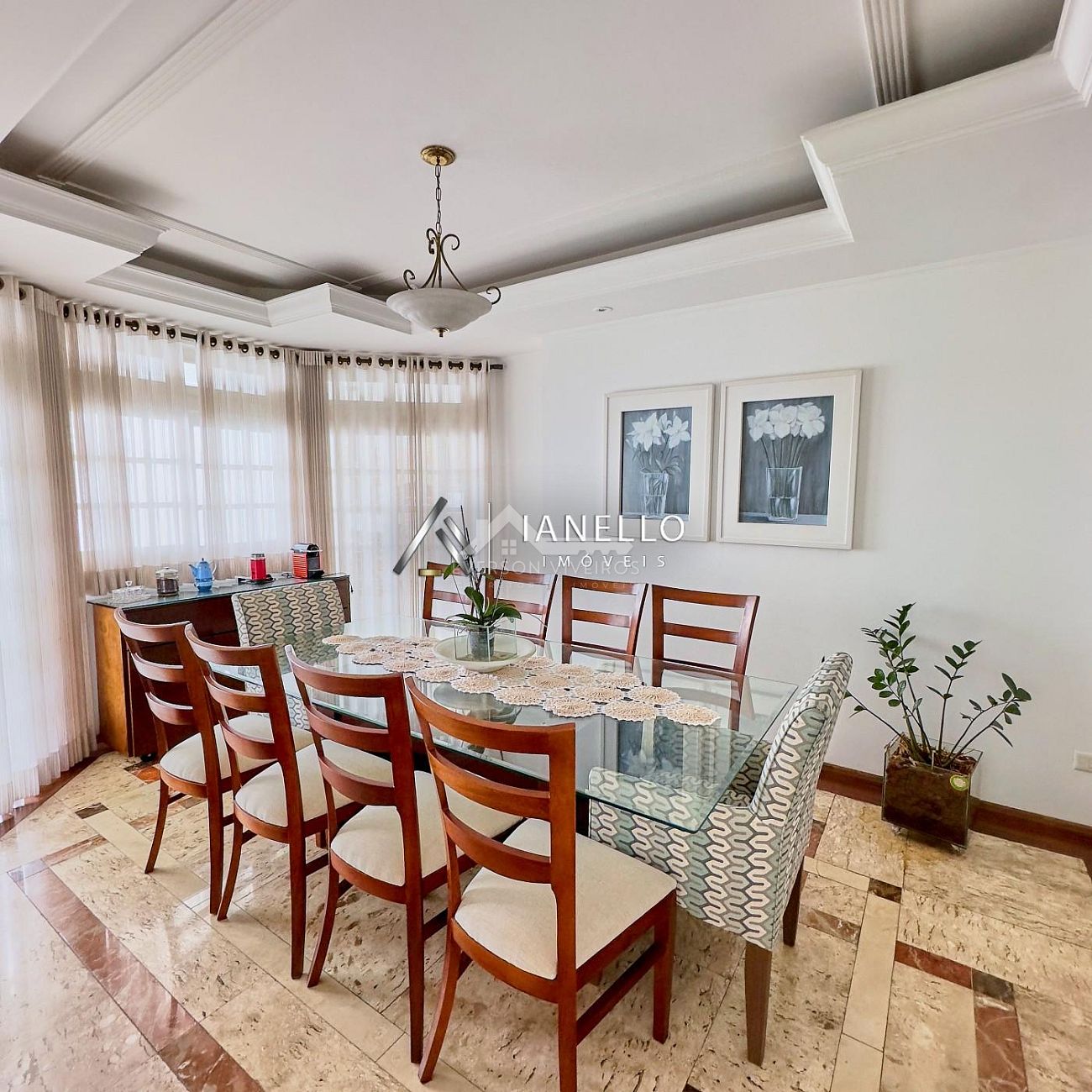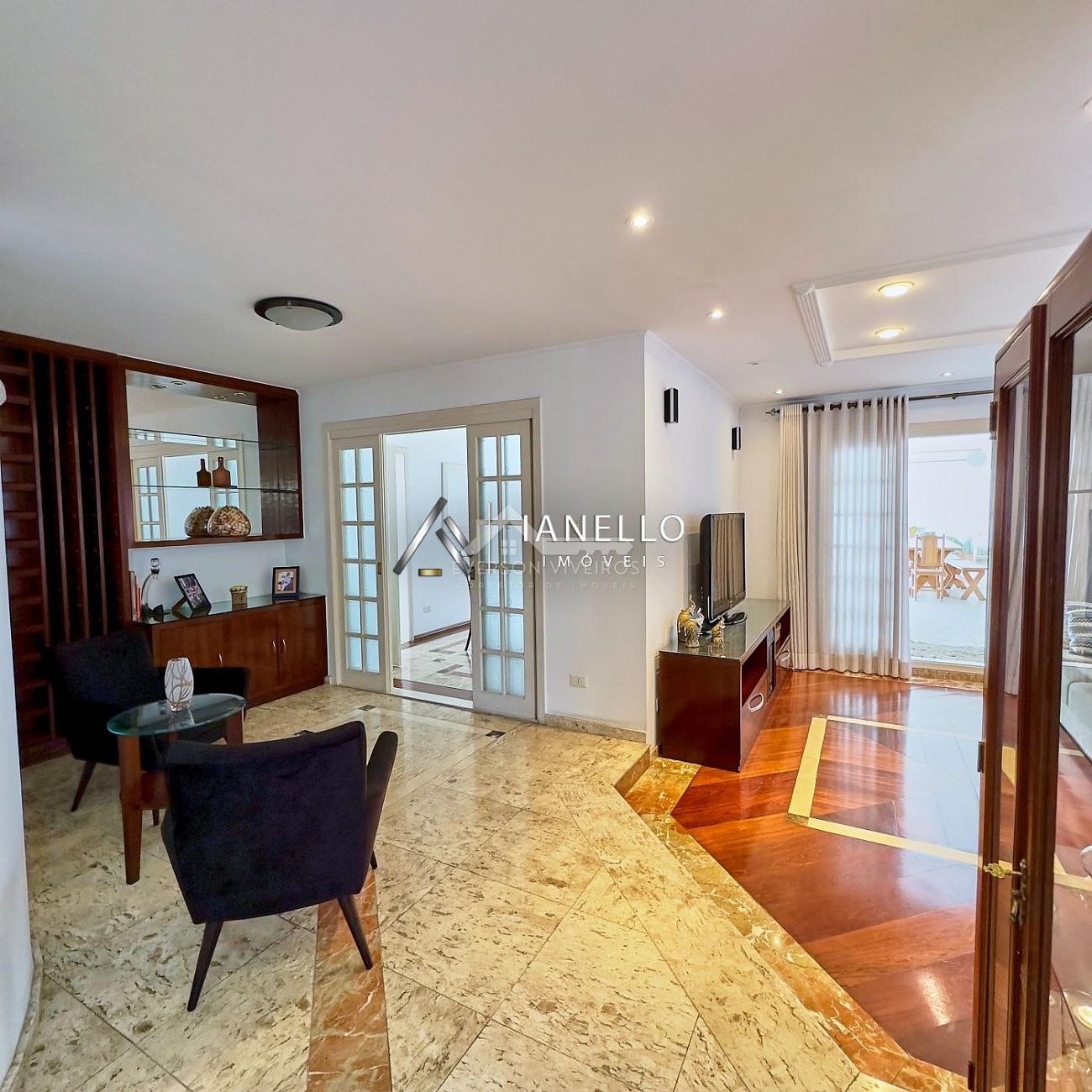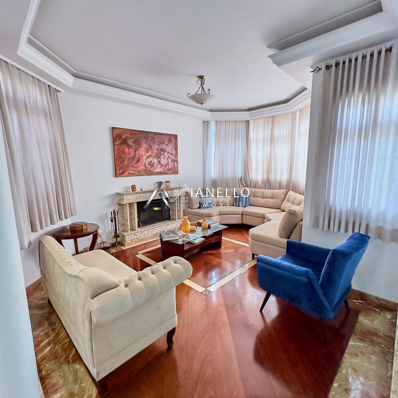 O living principal integrado reúne sala de estar, jantar e TV em perfeita harmonia, com destaque especial para a sala de lareira, que cria um ambiente intimista e convidativo para momentos em família.
