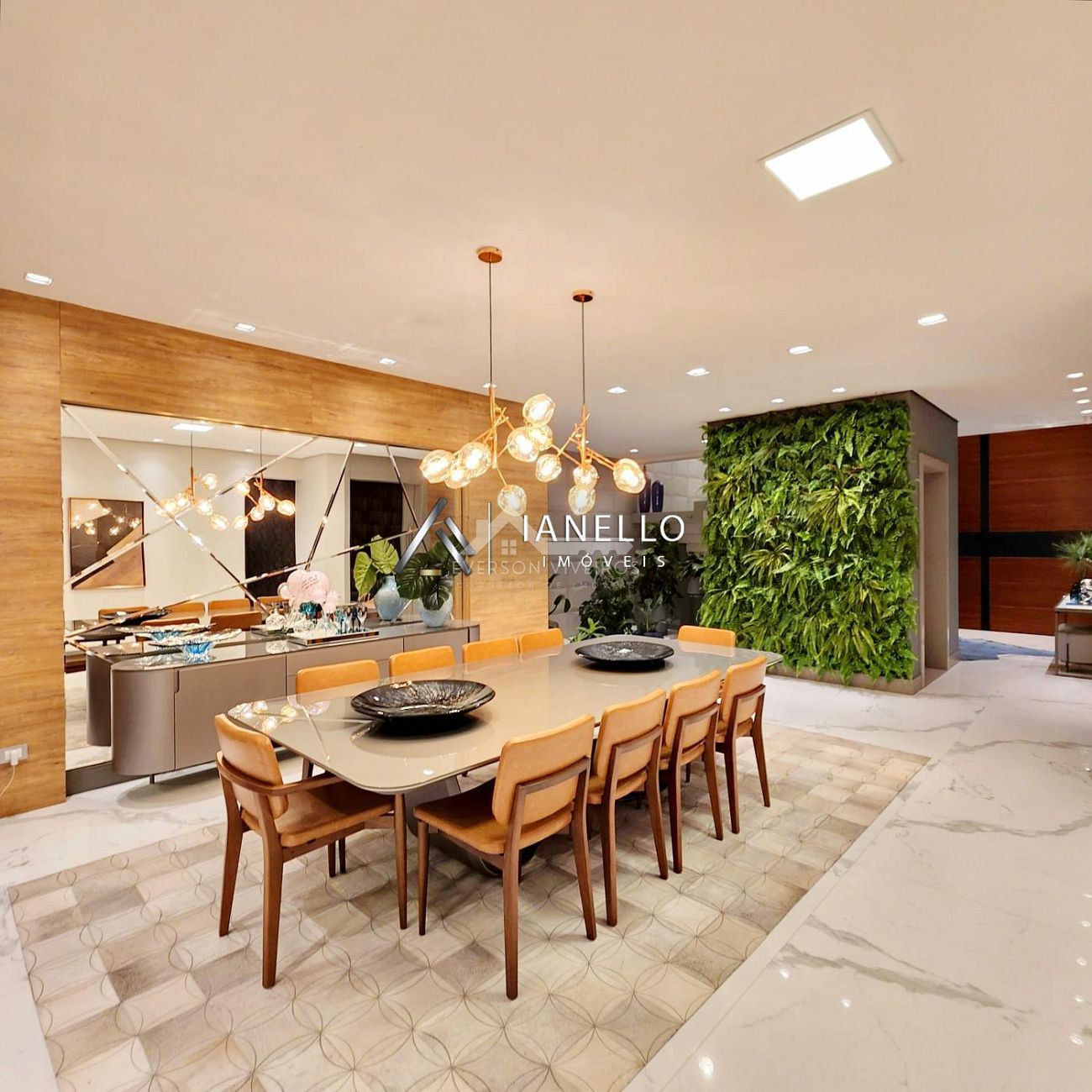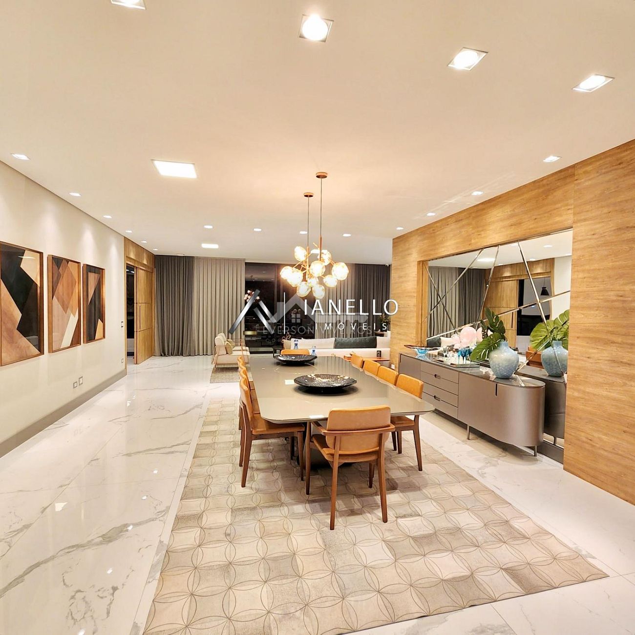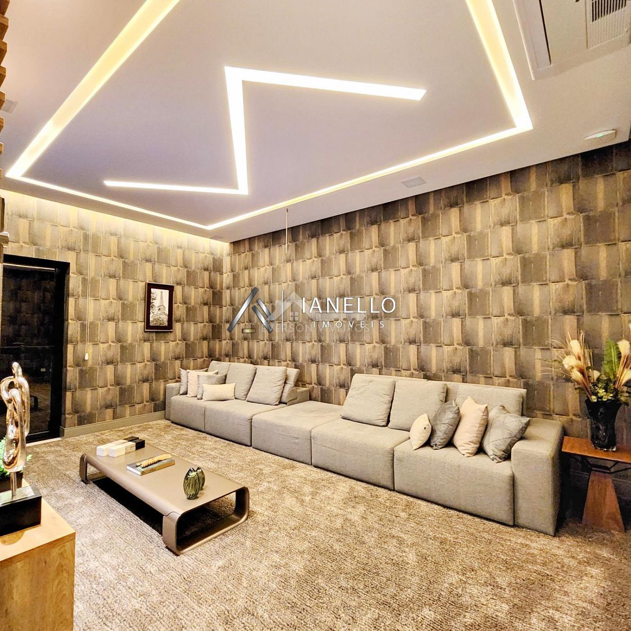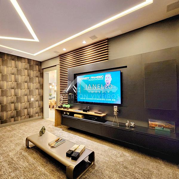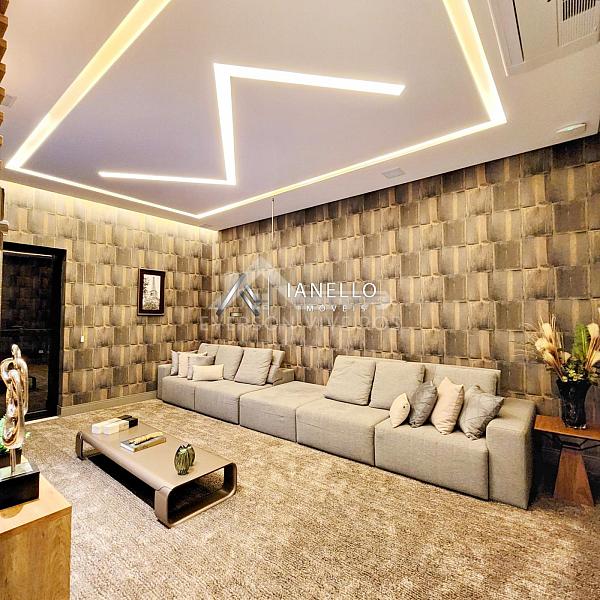 O living com pé-direito duplo integra sala de estar, jantar e lareira, criando um ambiente amplo, elegante e banhado por luz natural. Para o entretenimento, o home theater oferece experiência de cinema em casa, com ar-condicionado e sistema de som ambiente.