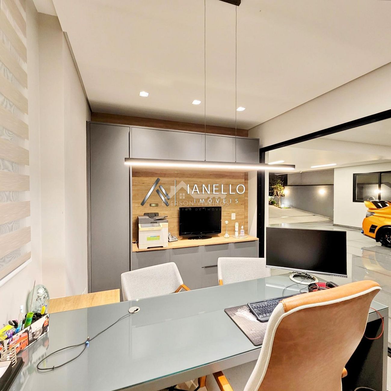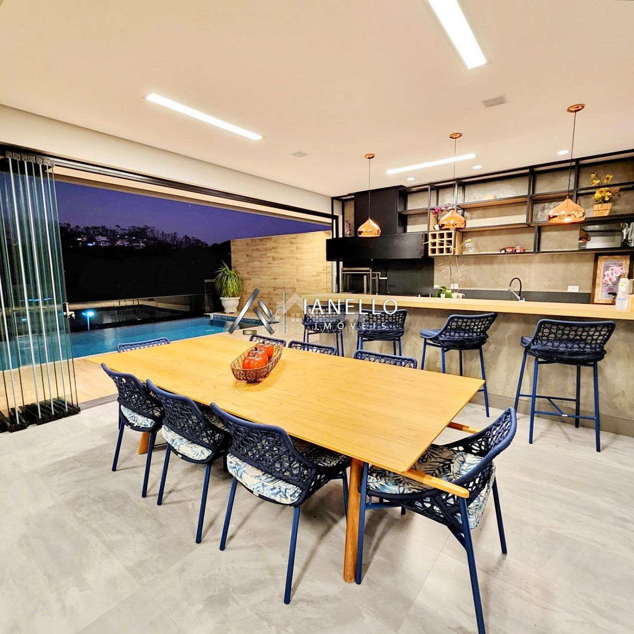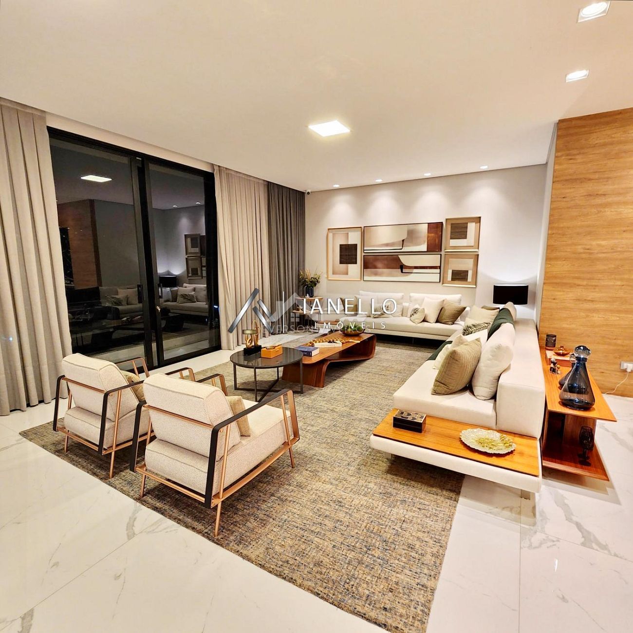 O living com pé-direito duplo integra sala de estar, jantar e lareira, criando um ambiente amplo, elegante e banhado por luz natural. Para o entretenimento, o home theater oferece experiência de cinema em casa, com ar-condicionado e sistema de som ambiente.