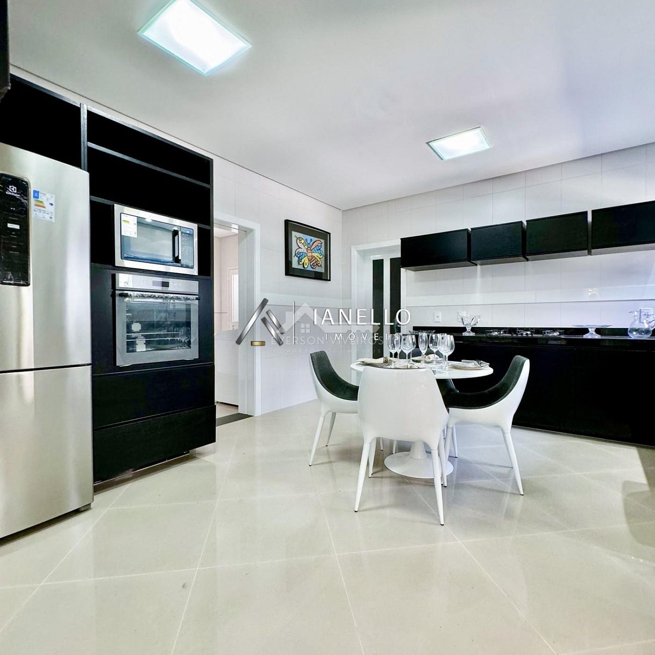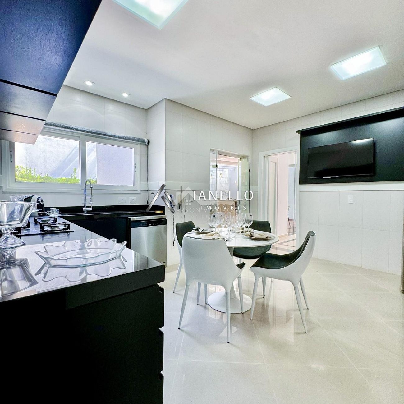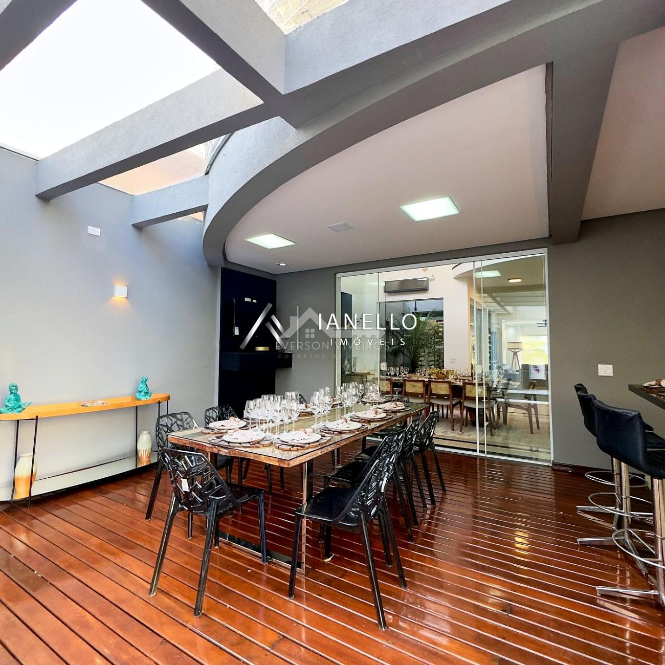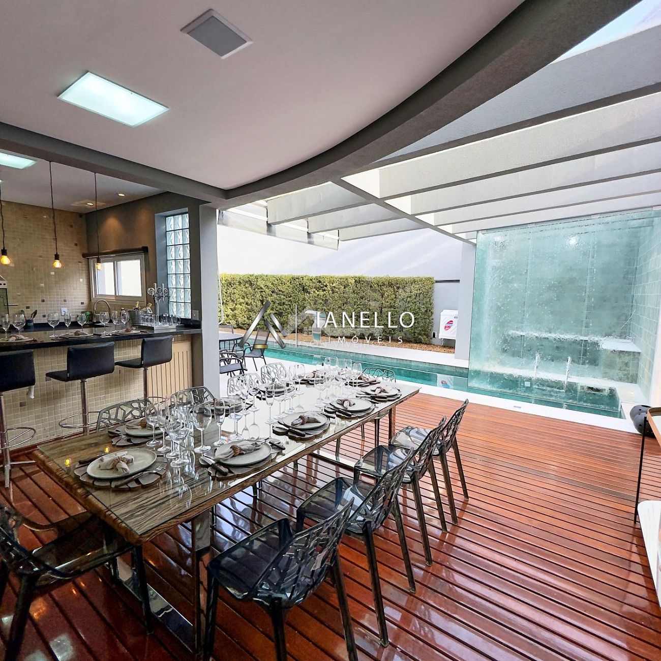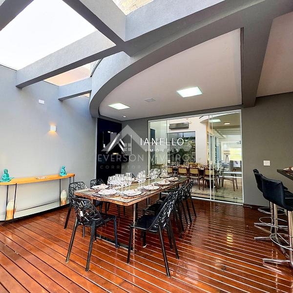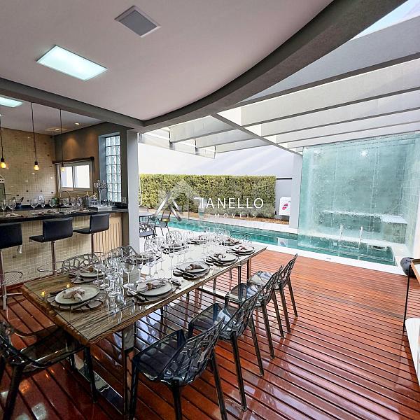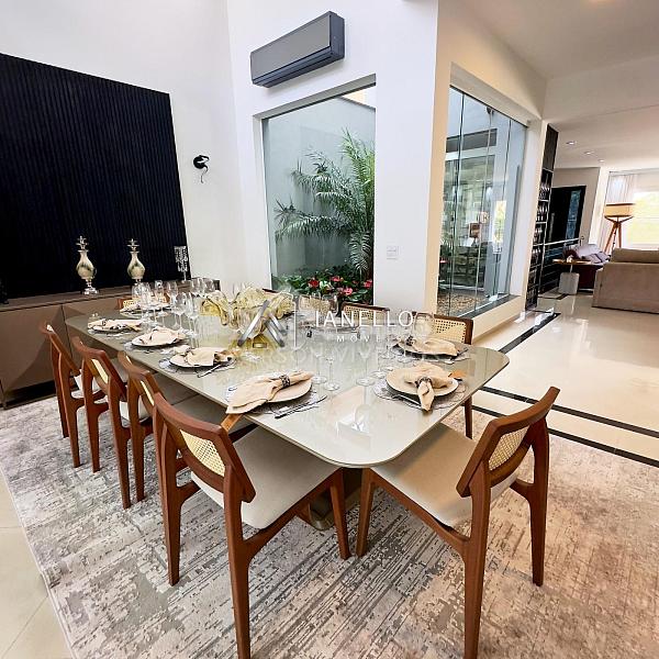 A sala de jantar, posicionada em frente à cozinha, conecta-se harmoniosamente ao espaço gourmet e ao quintal com piscina e sauna, formando o cenário ideal para lazer, celebrações e convivência.