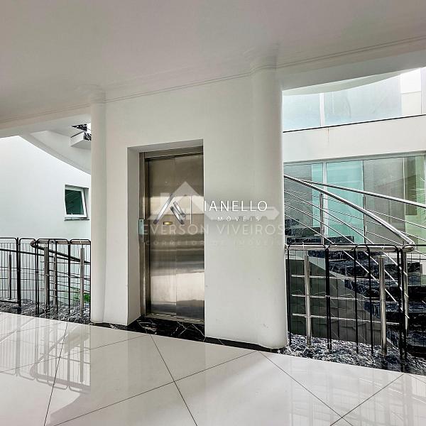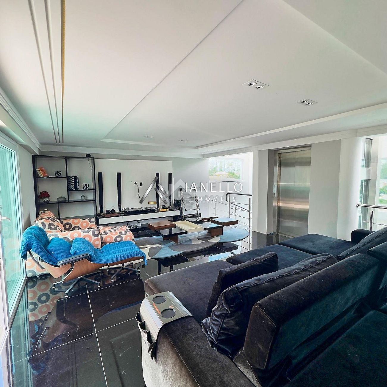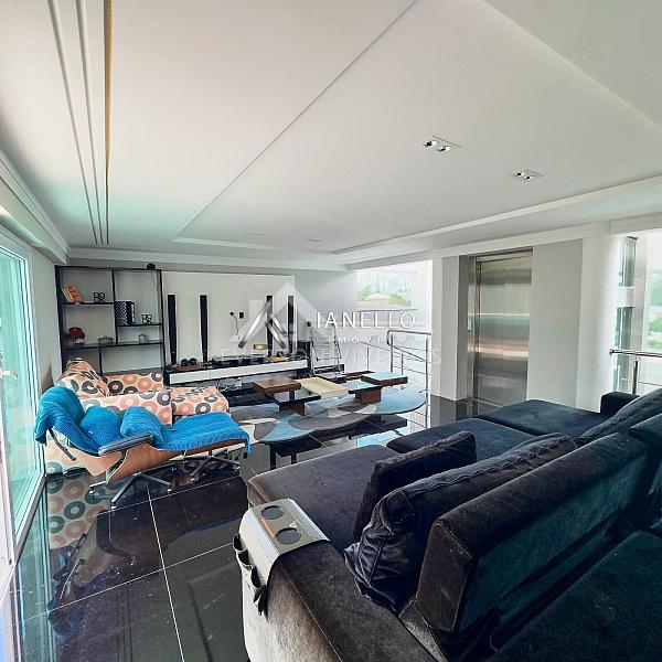 O projeto alia requinte e funcionalidade com elevador panorâmico, escritório privativo e lareira sofisticada, criando ambientes que atendem tanto ao lazer quanto à rotina com elegância.