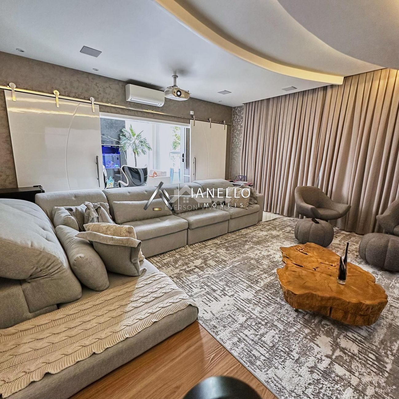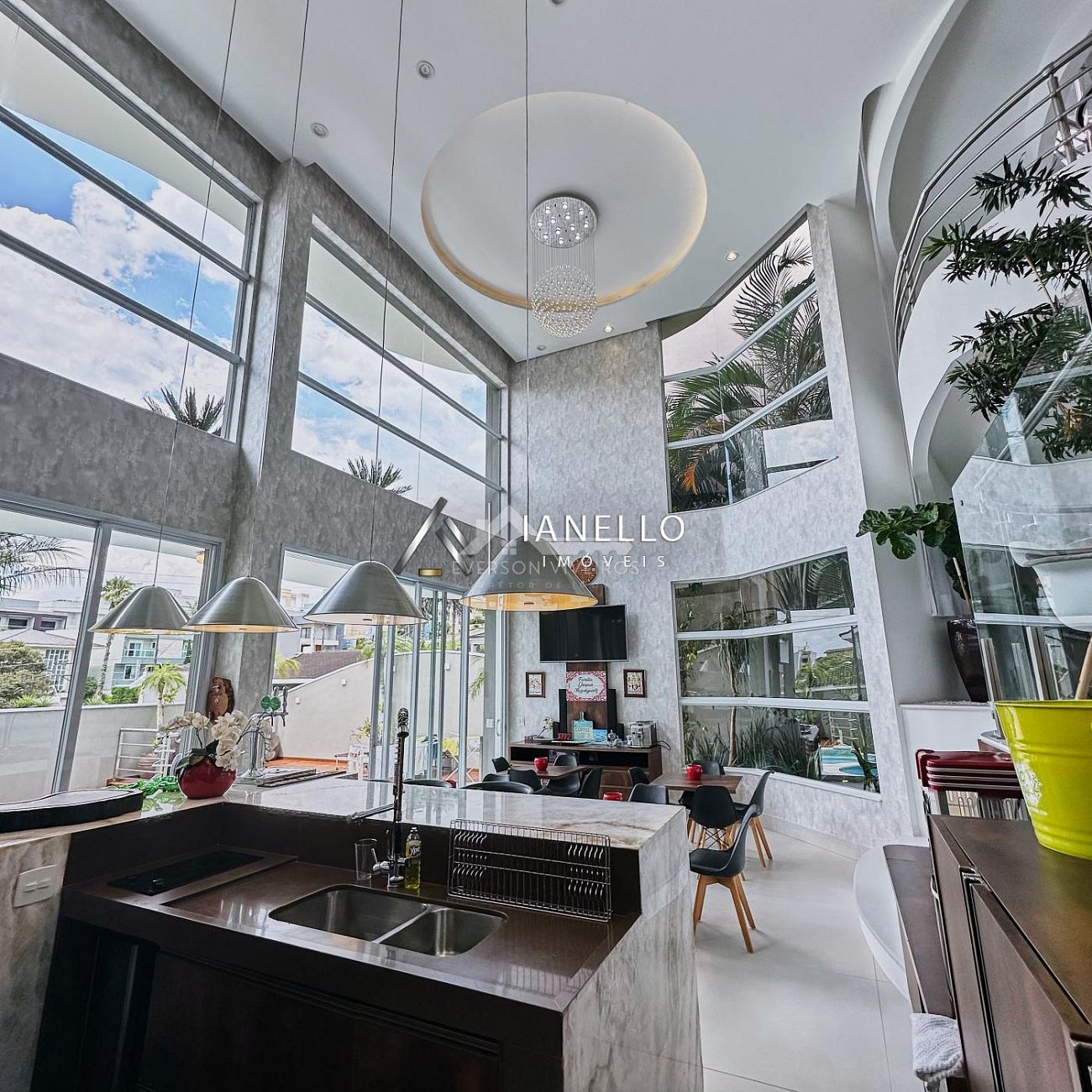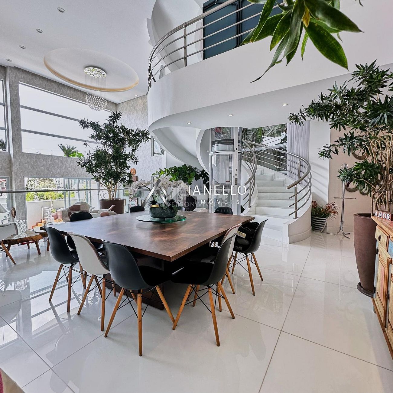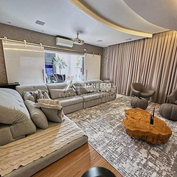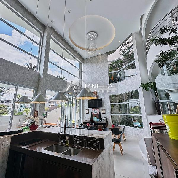 O projeto impressiona logo na chegada com a sala de estar de pé-direito duplo, integrada de forma harmoniosa à sala de jantar, criando um ambiente amplo, iluminado e acolhedor. A cozinha com armários planejados e ilha central une praticidade e design, ideal tanto para a rotina quanto para receber convidados.