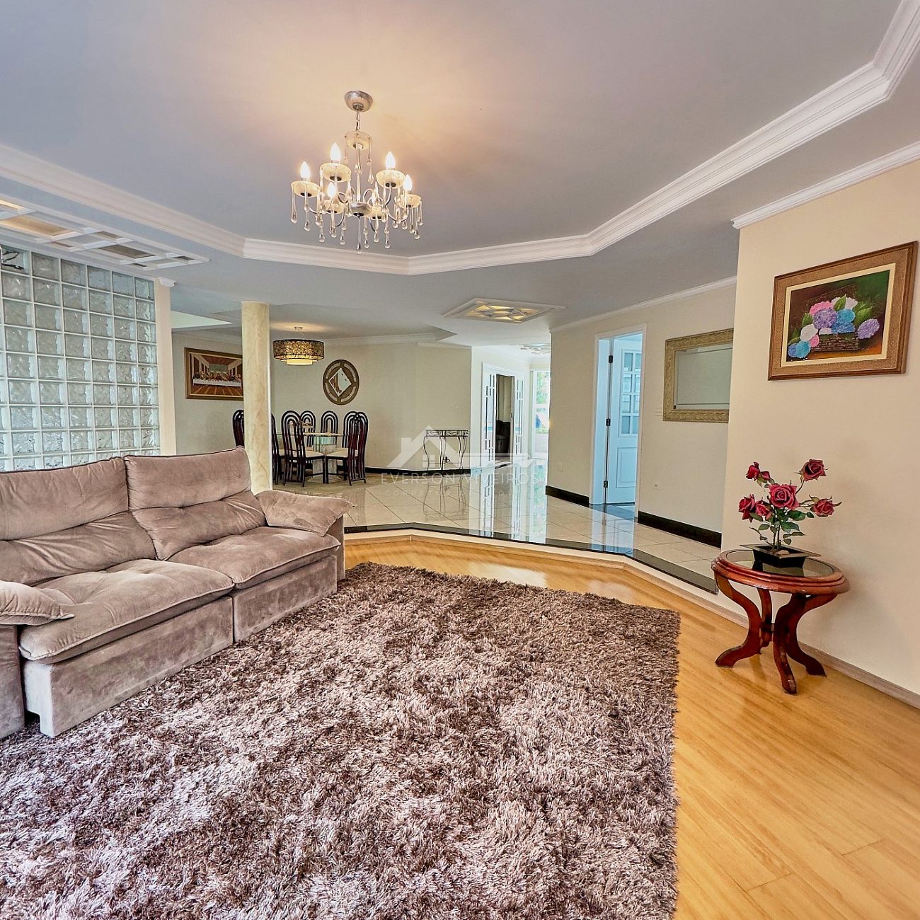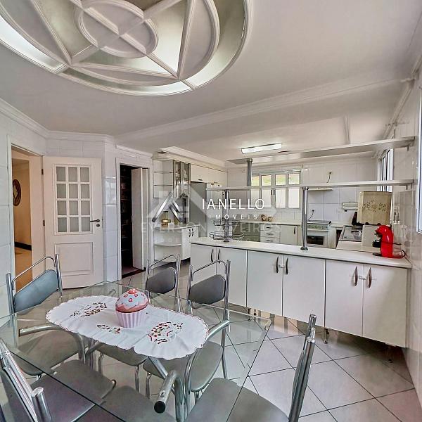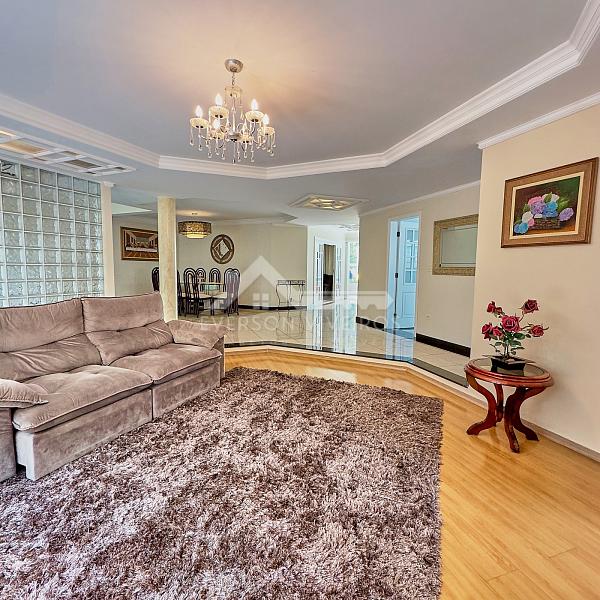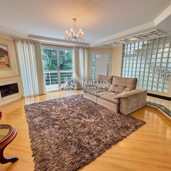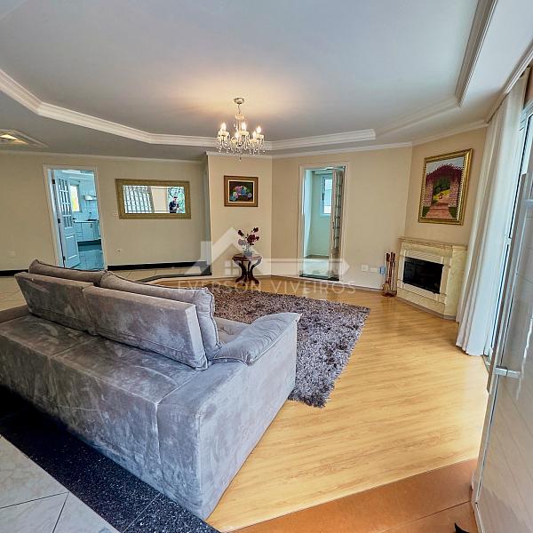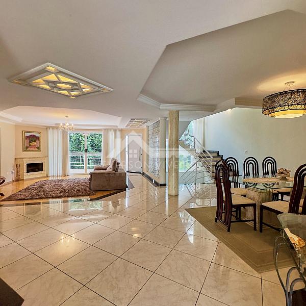 O living amplo e integrado conecta a sala de estar com lareira e a sala de jantar, criando um ambiente acolhedor e sofisticado, perfeito para receber amigos e familiares com estilo. A cozinha com armários embutidos se integra de forma prática ao espaço social, garantindo fluidez e praticidade no dia a dia.