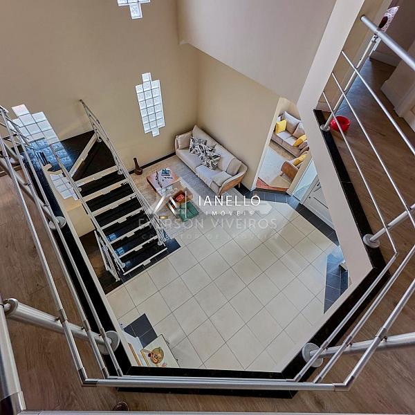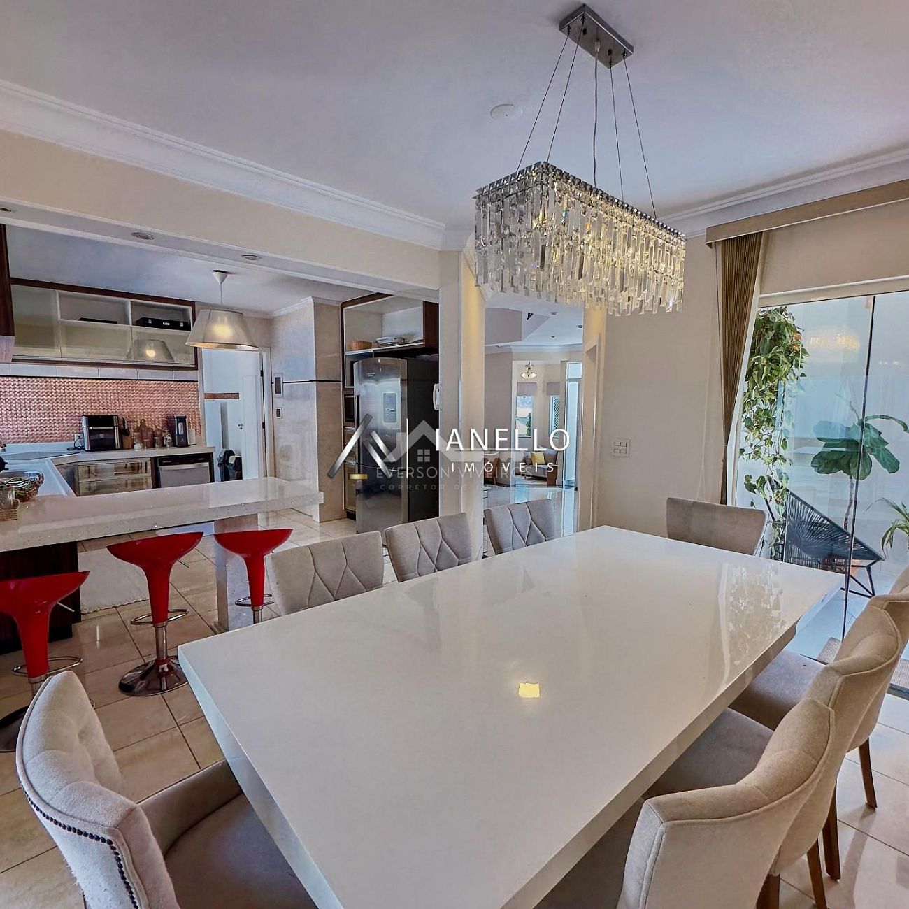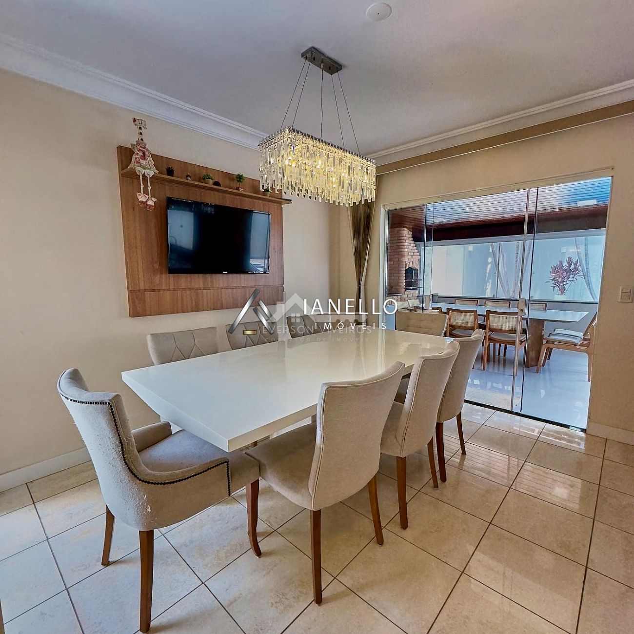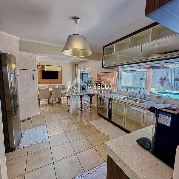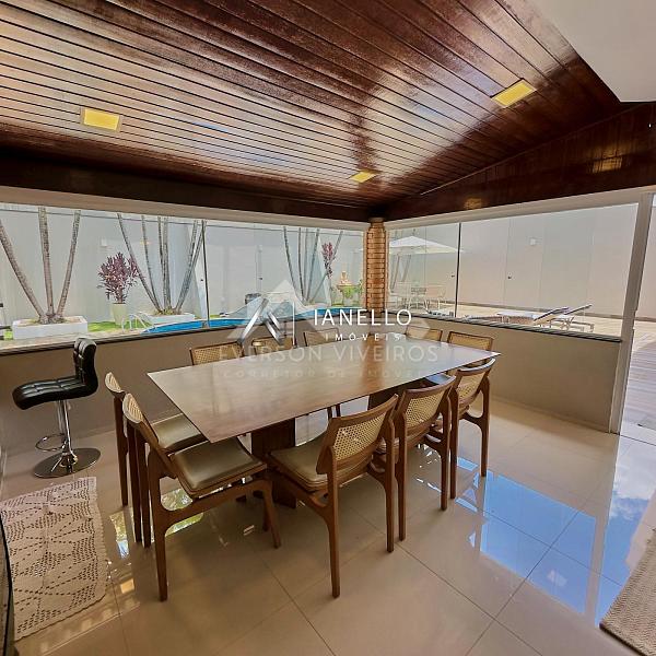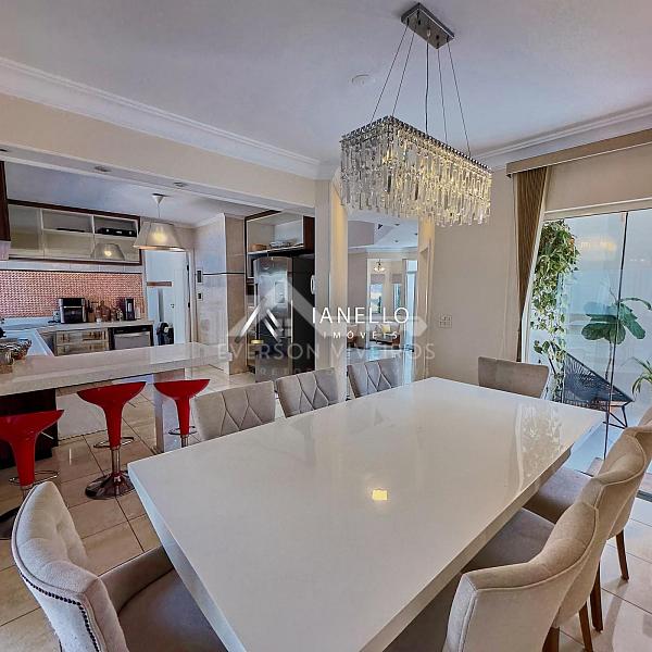 O living amplo integra sala de estar, lareira e sala de TV, criando um ambiente elegante e acolhedor, perfeito tanto para o convívio diário quanto para receber convidados. A sala de jantar conecta-se à cozinha planejada com armários embutidos, oferecendo funcionalidade sem abrir mão do design.