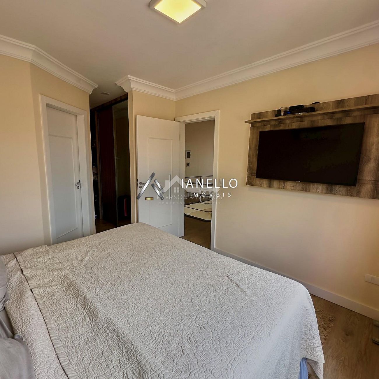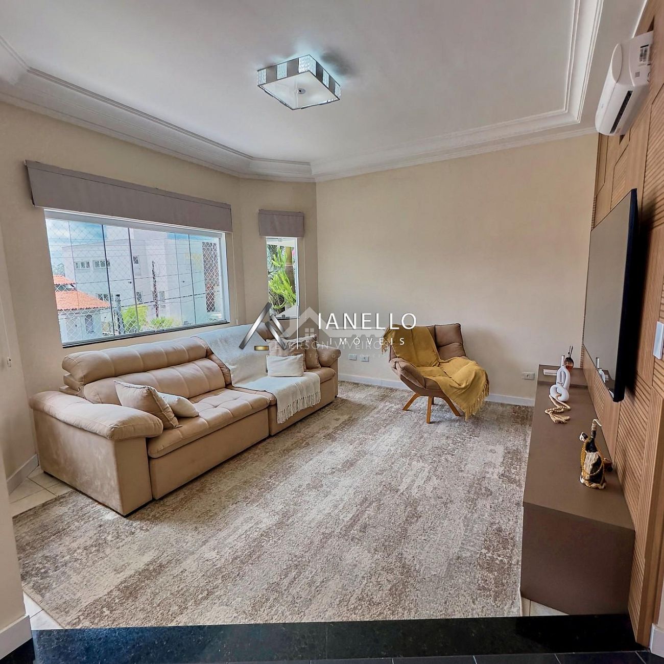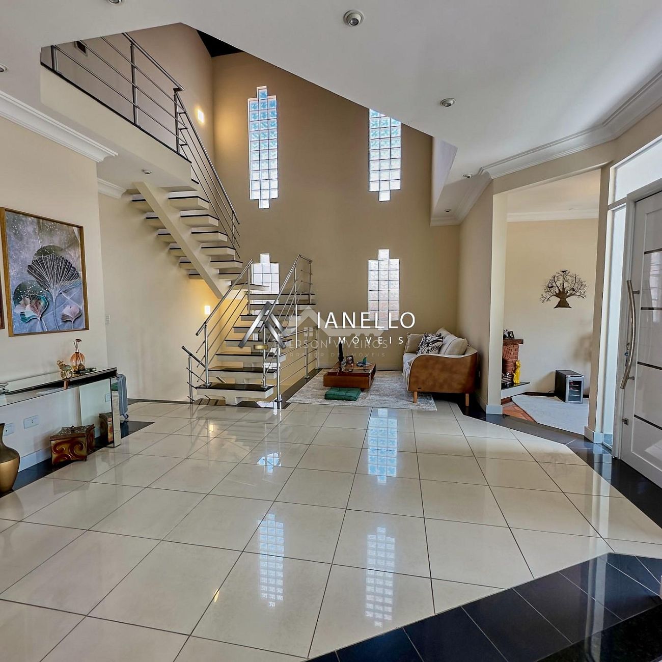 O living amplo integra sala de estar, lareira e sala de TV, criando um ambiente elegante e acolhedor, perfeito tanto para o convívio diário quanto para receber convidados. A sala de jantar conecta-se à cozinha planejada com armários embutidos, oferecendo funcionalidade sem abrir mão do design.